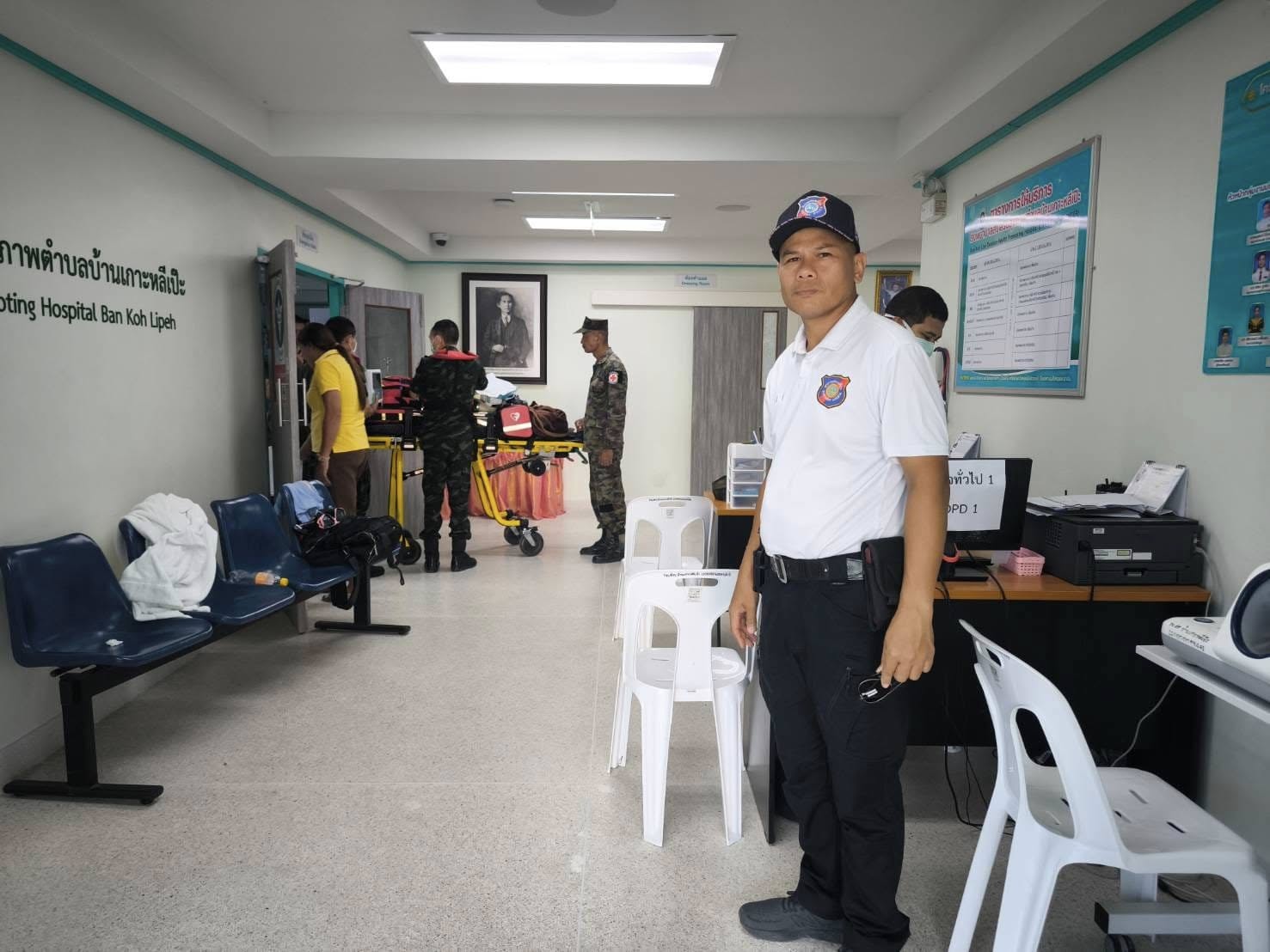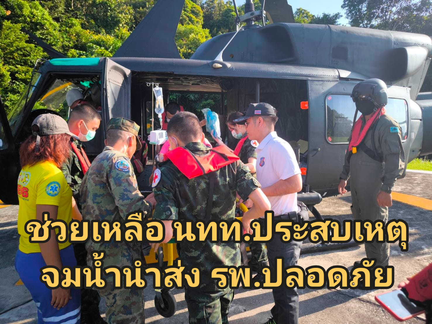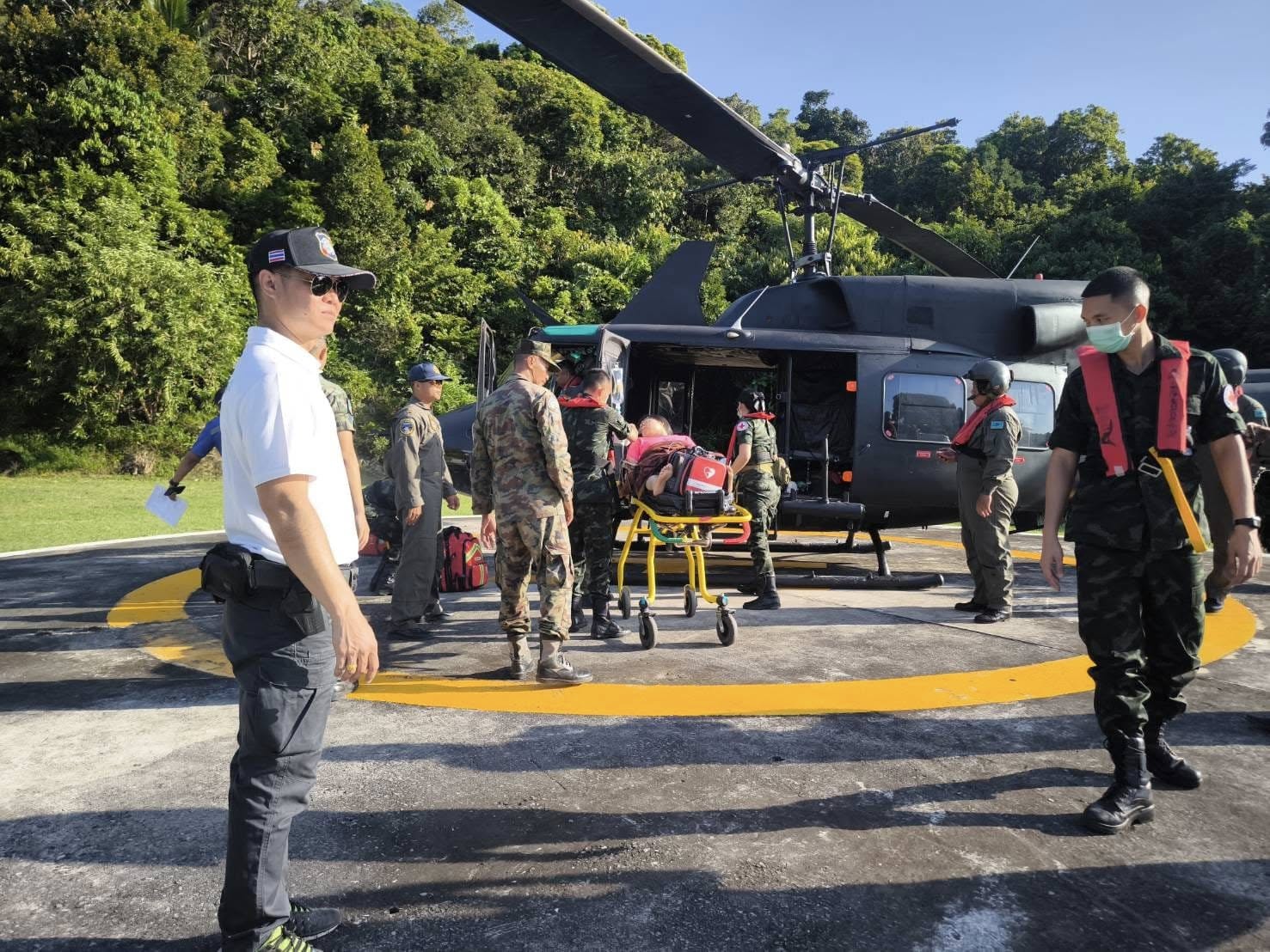 ชป.หลีเป๊ะร่วมกับเจ้าหน้าที่ รพ.สต.เกาะหลีเป๊ะ ช่วยเหลือนำผู้ประสบเหตุส่งตัวไปรักษาต่อที่ รพ.ธนบุรี ราษฎรยินดี หาดใหญ่ ทางเฮลิคอปเตอร์ของทหาร