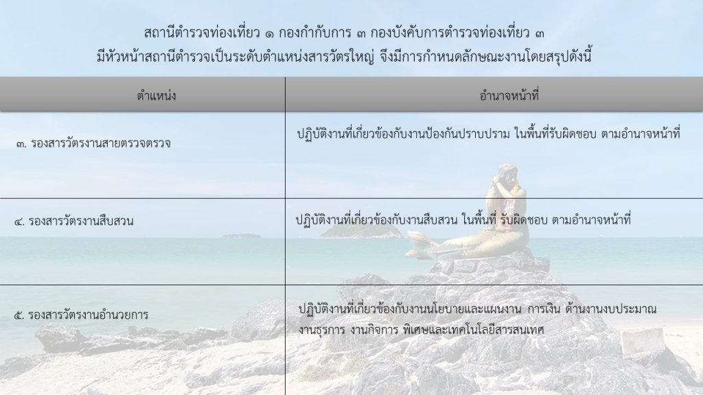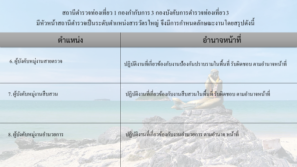 ผู้แทนพระองค์ และพระราชอาคันตุกะและรักษาความปลอดภัยบุคคลสำคัญ - ดูแลรักษาความปลอดภัยในชีวิต ร่างกาย และทรัพย์สิน ให้บริการ ความช่วยเหลือ และอำนวยความสะดวกแก่นักท่องเที่ยว