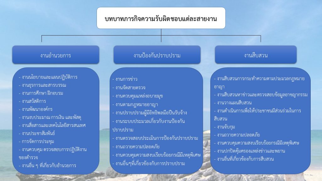 - ดำเนินการเกี่ยวกับการรักษาความสงบเรียบร้อย การป้องกันและการปราบปรามอาชญากรรมทั่วราชอาณาจักร การให้ความปลอดภัยแก่บุคคลสำคัญและประชาชน และการให้บริการช่วยเหลือประชาชน