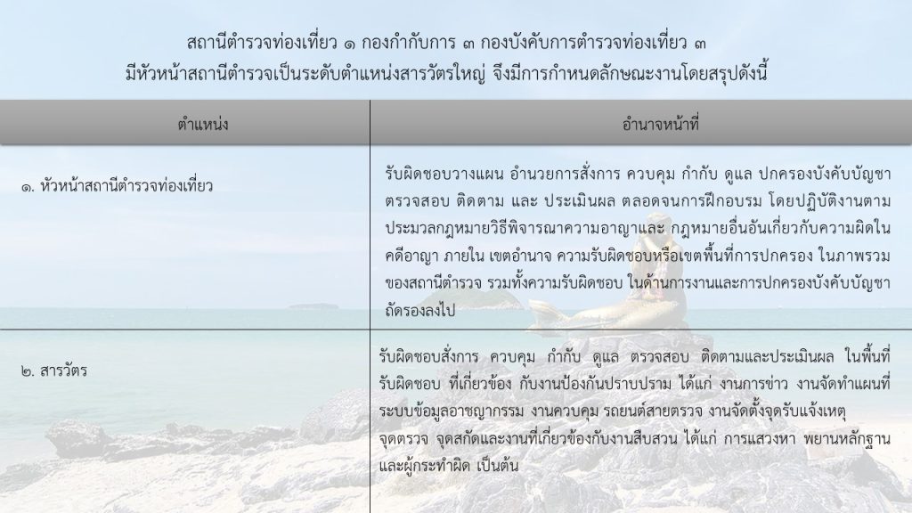 - ปฏิบัติงานตามประมวลกฎหมายวิธีพิจารณาความอาญาและกฎหมายอื่นอันเกี่ยวกับความผิดทางอาญาทั่วราชอาณาจักร ทั้งในกรณีที่ผู้เสียหายหรือผู้ต้องหาเป็นคนต่างด้าวซึ่งเข้ามาในราชอาณาจักรเป็นการชั่วคราวเพื่อการท่องเที่ยวหรือเพื่อการอื่นตามกฎหมายว่าด้วยคนเข้าเมือง ในกรณีที่มีผลกระทบต่ออุตสาหกรรมท่องเที่ยว และในกรณีความผิดอื่นที่เกี่ยวข้อง